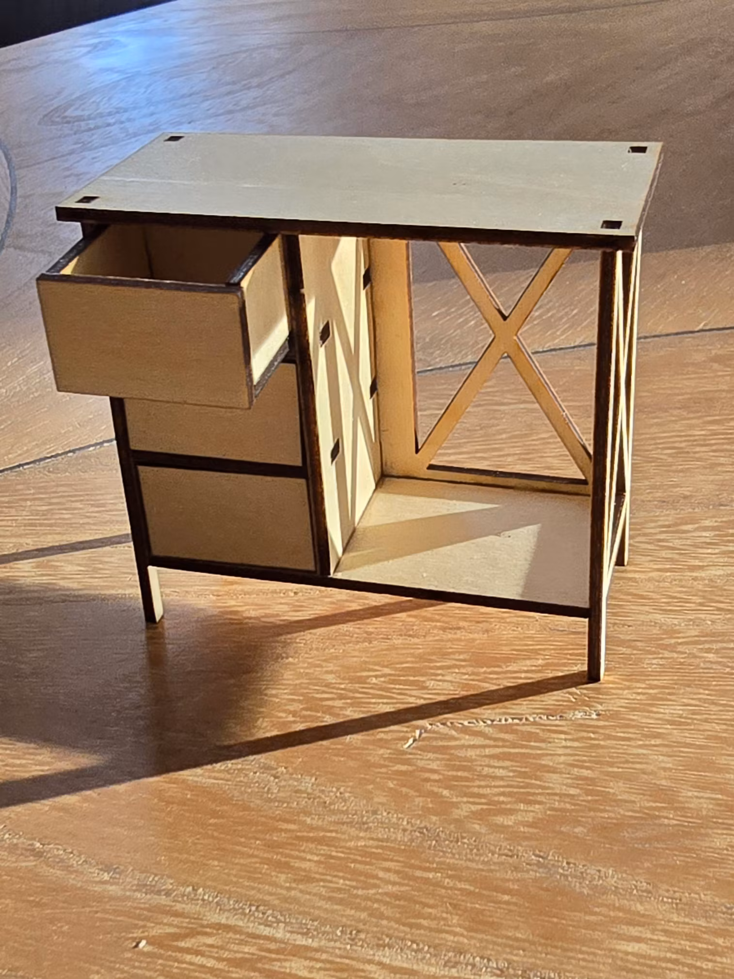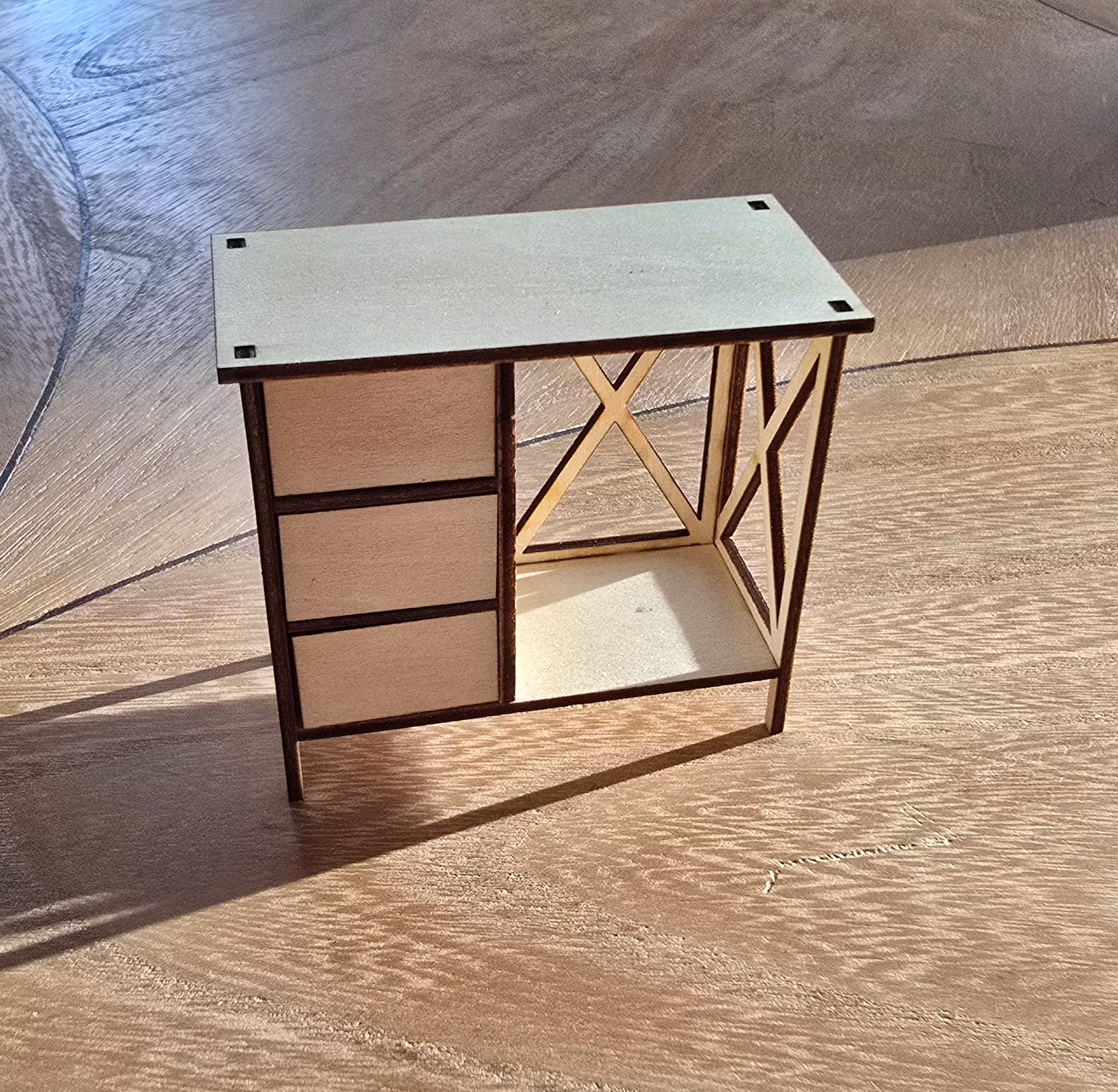 Detta är en byggsats som är laserskuren i trä. På denna modellen kan man välja vilken sida lådorna ska vara på när man bygger ihop den!